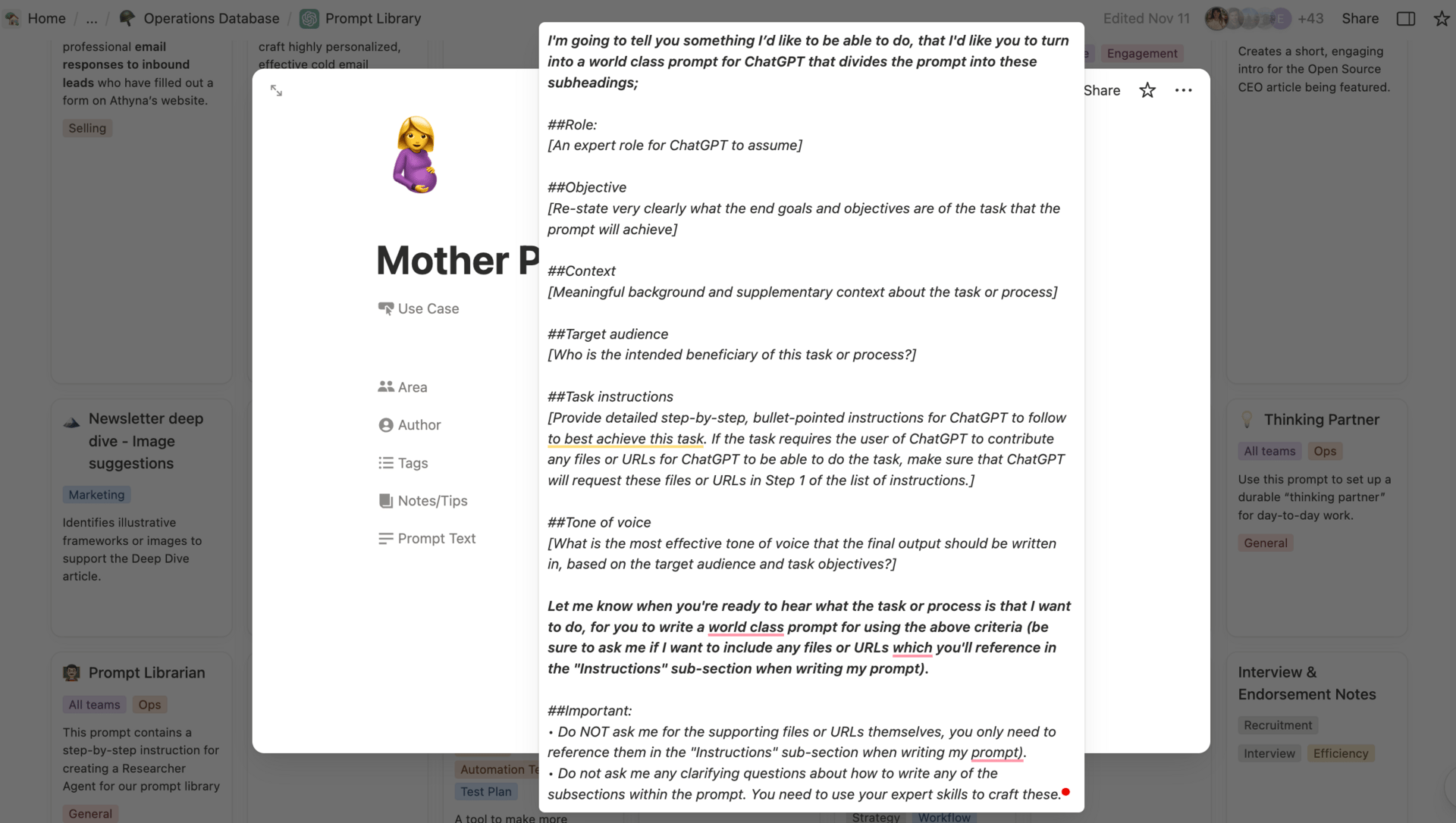 3/ The third step is to create a place for all prompts to live. A ‘prompt library’ as it were. This will be the home for all useful prompts. We use a Notion database with separate views, split into a general view and one for each department. For the sake of cleanliness, AI council members ensure that all prompts are entered to a high standard. Everyone is going to have their own projects, prompts, artifacts, and custom GPTs spread across a number of platforms, but think of the prompt library as the high-level, super valuable, and nicely polished resources.