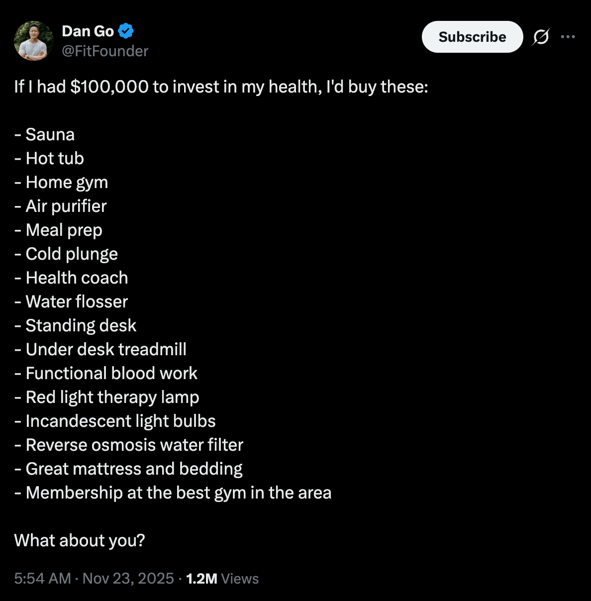 I saw this tweet from fitness guy Dan Go the other day and it really fired me up. I am a very simple man with my wants, and as a recovering broke founder that can now actually afford to eat ramen from a restaurant rarther than ramen from the Chinese grocer, I need places to spend my money. And this is honestly the ultimate Christmas list for me.