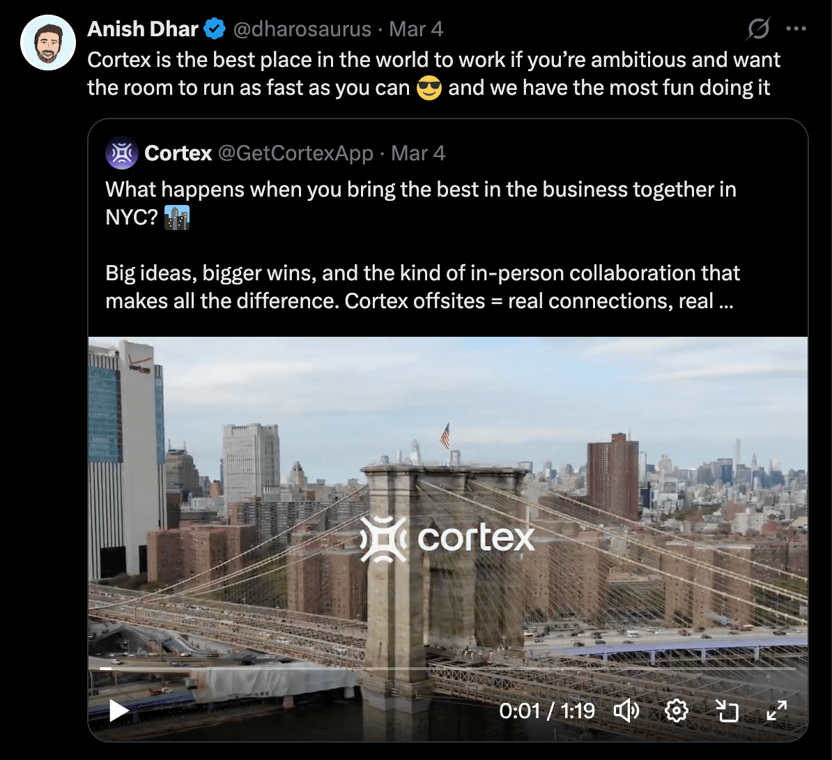 Personally, I think it's a few different things. One, I have a really close relationship with my co-founders, and I think that's a very important part of our journey at Cortex, because there's no one who really understands what you're going through like your co-founder. When you're on the same wavelength and can talk about problems across the company and just have really open, honest conversations, it really strengthens the culture and also just makes you a more effective leader because you can give each other feedback and be very open about it. Generally, that's the kind of culture that we've tried to embody in Cortex—to be very open and give feedback when needed.