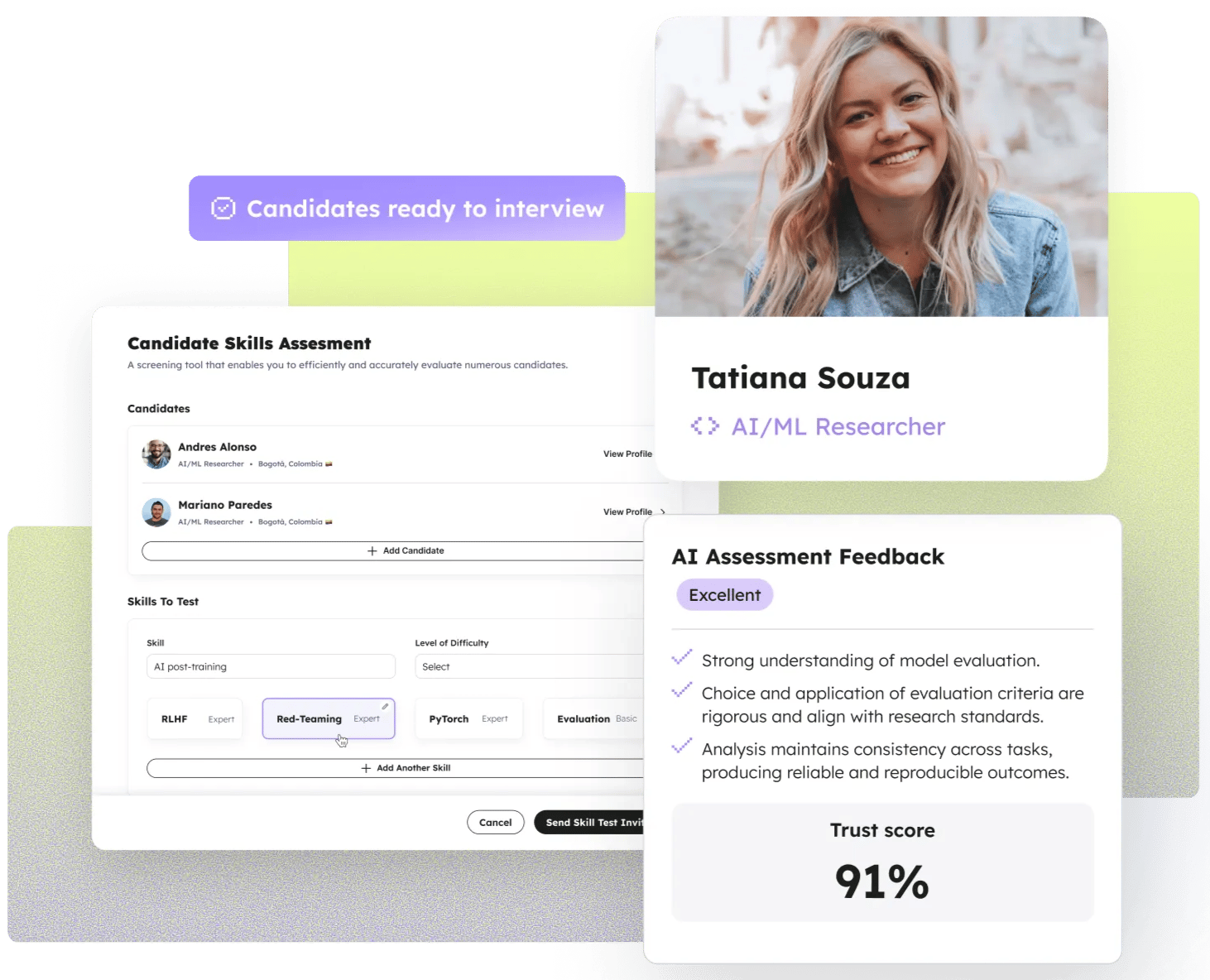 For technical roles, we run embedded assessments. Actual work simulations that show us how someone thinks, codes, debugs, and collaborates under real conditions. Now we're taking that same infrastructure and applying it to a completely different challenge: finding PhD-level researchers for AI post-training. Different talent pool, different eval criteria, but the same backbone that's already proven it works at scale.