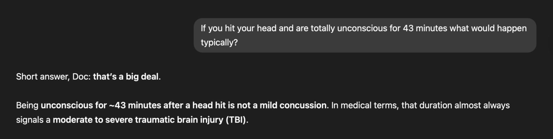 I woke up 24 hours later, strapped down to a hospital bed. I had hit my head so hard that I was out cold and immediately soiled myself right there in the middle of the dancefloor (yes, it happens). In the end, I was totally unconscious for 43 minutes. Long enough for the ambulance to call my parents to tell them I was suspected of brain damage and spinal injury. Donāt believe me? Ask ChatGPT.