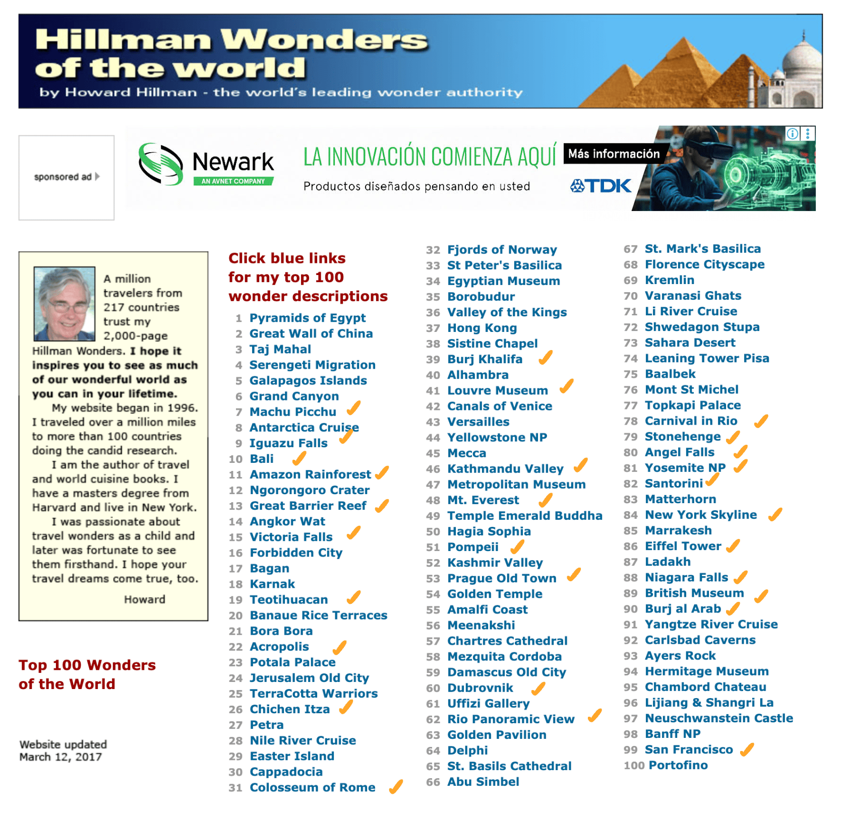 And thatās what I did. A quick Google of ābest things to see before you dieā led me to the website of Howard Hillmanās 100 Wonders of the World. This became my bible. The next year, once healthy, I took off and began ticking off items on Hillmanās list. I kept one version in my travel diary for myself and another to give to someone else if the opportunity arose. I printed off and handed out dozens of them.