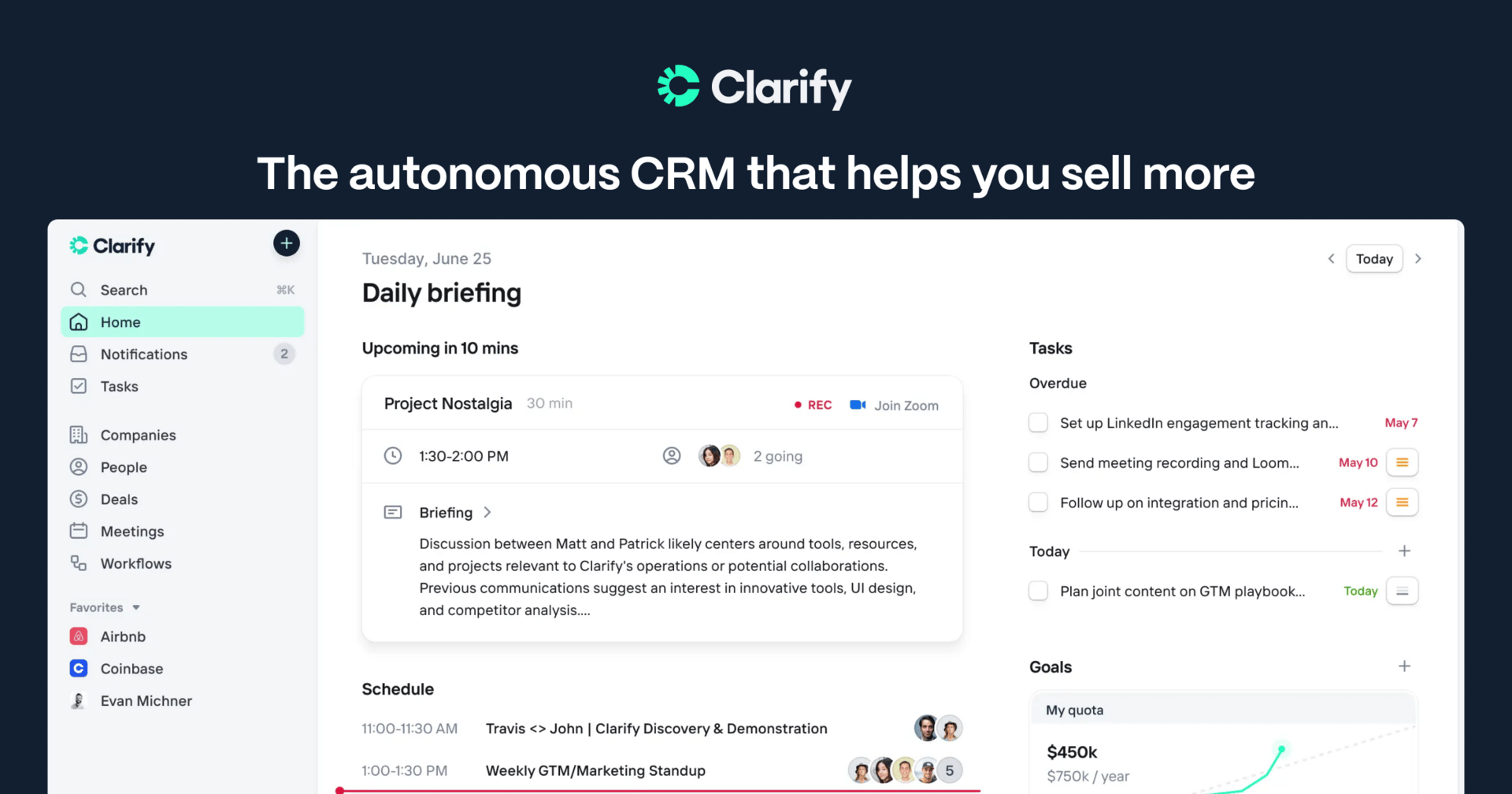 Building a company is hard enough, and your CRM shouldnât feel like another job. Clarify updates your pipeline, preps you for meetings, and takes notes so nothing slips through the cracks.