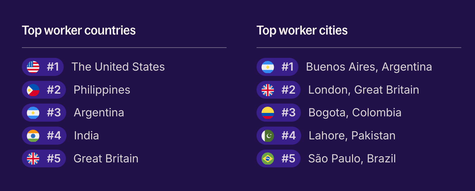 More interesting data: The United States, Philippines, Argentina, India, and Great Britain were the top countries for workers in 2024, while Buenos Aires, London, Bogotá, Lahore, and São Paulo ranked as the top cities for workers.