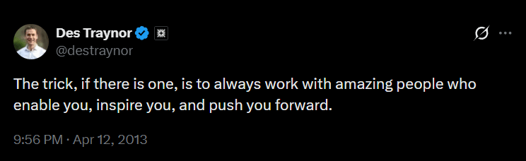Known for his clarity of thought and product intuition, Traynor is also a respected voice in the tech world, frequently sharing insights on product-market fit, startup scaling, and customer experience. He’s spoken at events like Web Summit and SaaStr, and actively invests in early-stage startups, including Notion and Manna.
