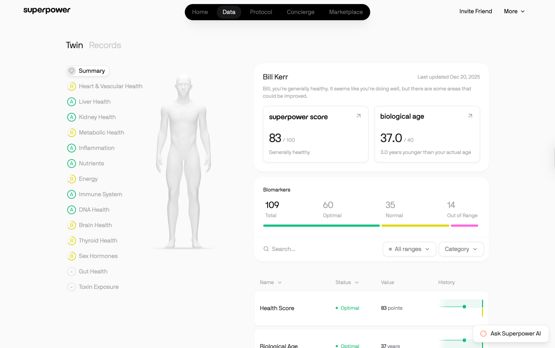 I’ve started using Superpower recently, a health tech startup that is growing like a rocket. How it works is: you do a blood draw, and then they send you 100+ biomarkers, with a protocol to follow for the areas you need work. I scored a B overall, with a -3 from chronological age to my biological age. Pretty good, but it wasn’t all good.