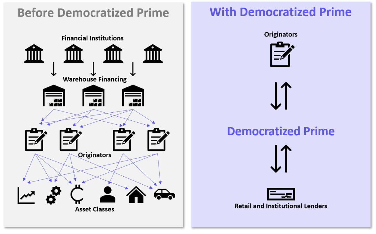 The bigger story here, though, is what this unlocks in the future. Democratized Prime takes the old āwarehouse lineā that only banks could tap and turns it into a transparent market: originators pledge loans, borrow against them, and keep funding more credit. HELOCs come first, next you could have autos and student loans. You donāt just create a new product; you change the cost of capital entirely.
