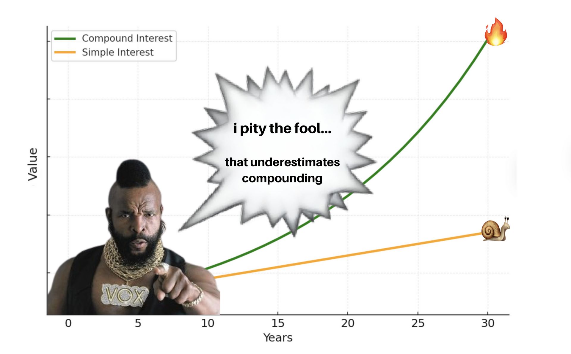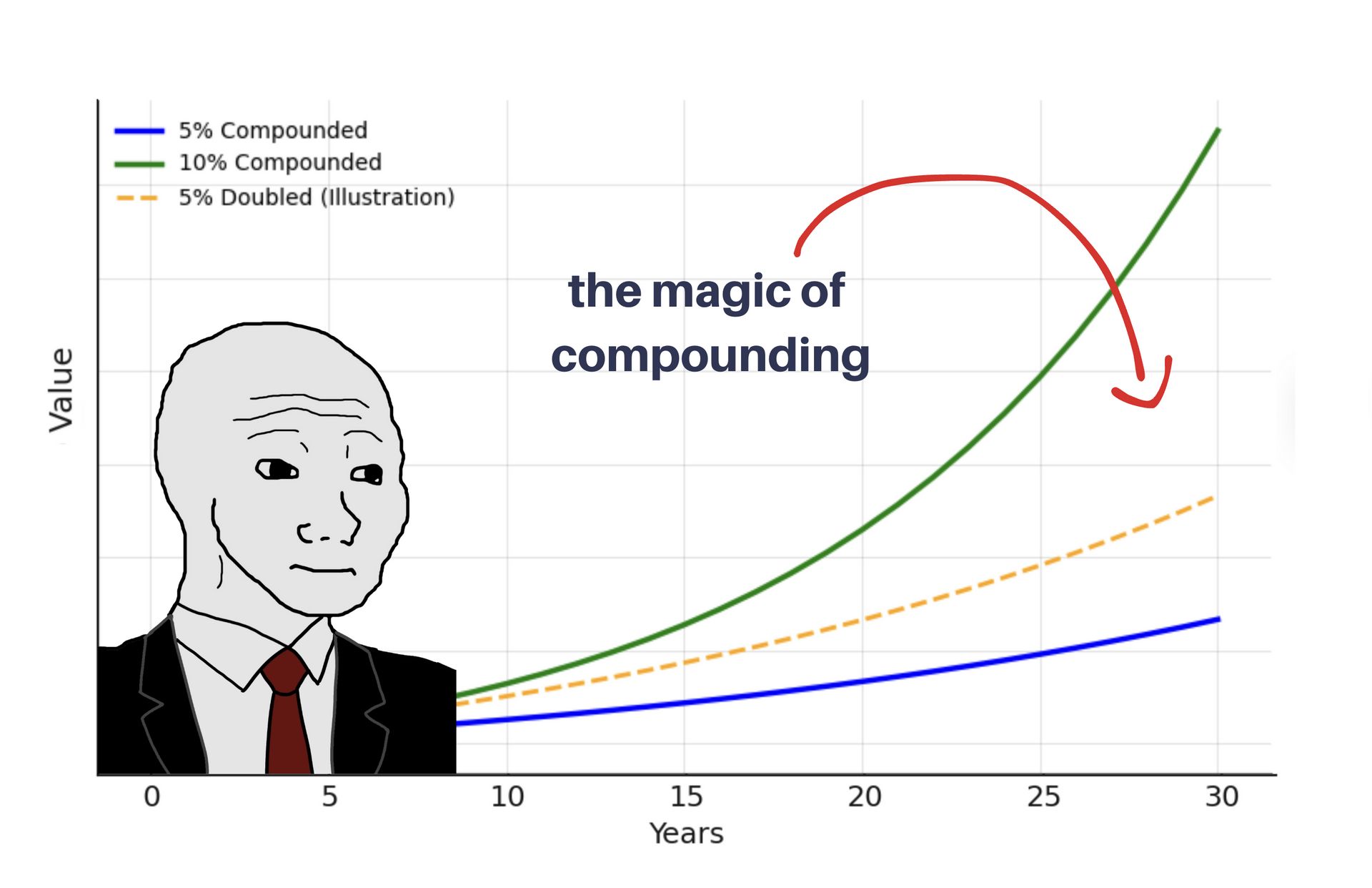 People often assume that if you double your return, youāll double your money. Thatās not how compounding works. Letās say you earn 5% a year on $10,000. After 30 years, youāll have around $43,000. Pretty neat.