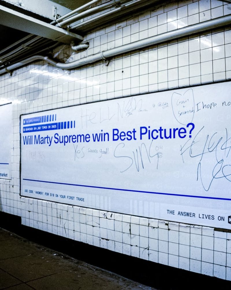 Will Marty Supreme win Best Picture? What price will Bitcoin hit in 2026? Who should win the next election? They are doing two things here: 1) aligning with the brand of making predictions, and 2) inviting graffiti, UGC, and even a viral moment. I despise this company. But game gotta recognoze game sometimes.
