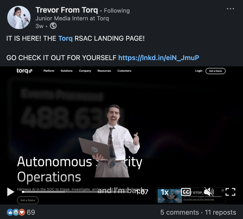 Another fun one I found recently was Trevor from Torq. Trevor claims to be a junior media intern at the Series D cybersecurity unicorn, but really, what Trevor is is an old-fashioned hype guy. You know the buddy you want around you at the party your crush is at because he’ll tell all the best stories on your behalf; that type of hype guy.